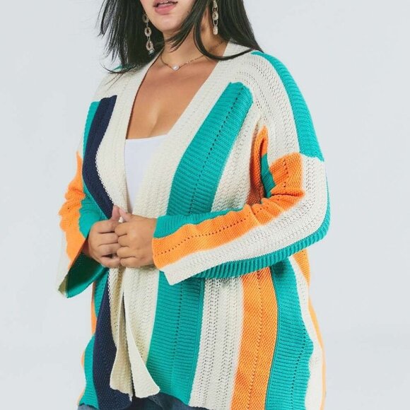 cardigan, colorblock cardigan, striped knit sweater, multicolor cardigan, open front cardigan, lightweight knitwear, boho chic cardigan, casual layering sweater, trendy plus size clothing, cozy fall cardigan, oversized sweater