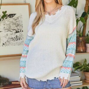 Boho Distressed White Knit Sweater with Colorful Aztec Print Sleeves