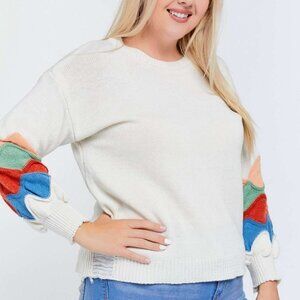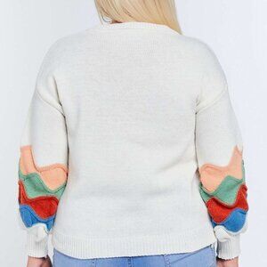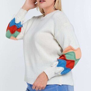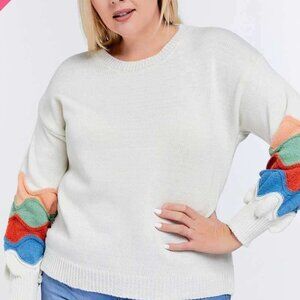 DAVI & DANI PLUS SIZE White Sweater with Color Block Wave Sleeves, Cozy Knit