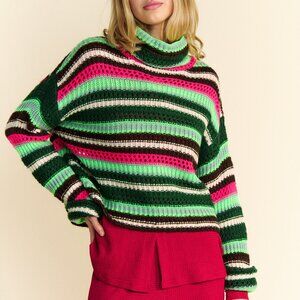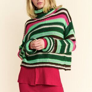 Colourful Striped Knit Turtleneck Sweater, Pink Green Brown White, Cozy Boho Chic