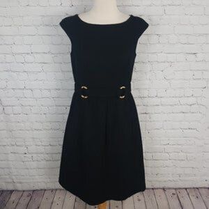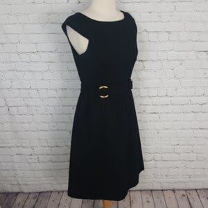David Meister black waffle textured sheath dress with cap sleeves. Attached belt with bamboo gold ring detail at waist. Modest neckline. Transitions easily from work to night