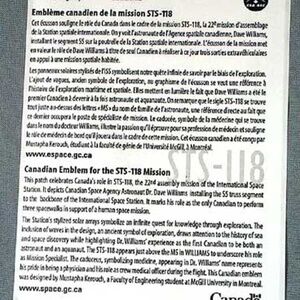 BACK OF STICKER: Back is titled Canadian Emblem For The STS-118 Mission and the text is in French and English. Two paragraphs describe mission and the design.