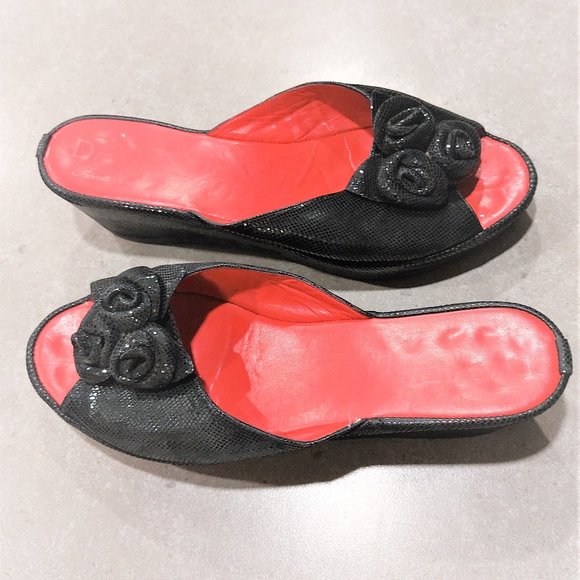DAVID Women's Black Leather Upper Platform/Wedge Sandals w/Rose Accents 8M