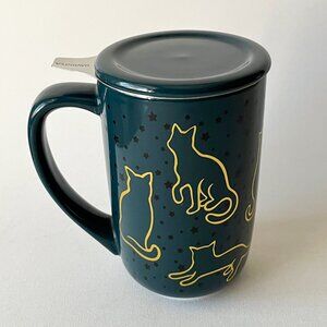 DAVIDsTEA mug, cat tea mug, infuser mug, cat lover gift, celestial, gold cat design, dark teal mug, tea cup with lid, cozy tea mug, DAVIDsTEA collection, cat silhouette, nighttime theme, modern tea mug, collector mug]