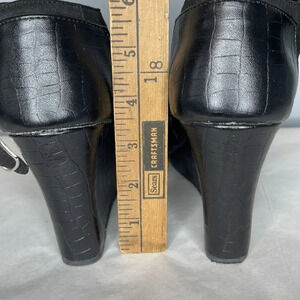 Ladies black Dawgs embossed crocodile print faux leather crossover chunky platform open round toe ankle strap 3.5” wedge heel shoes.