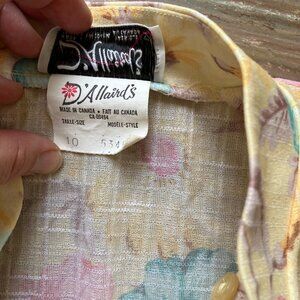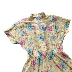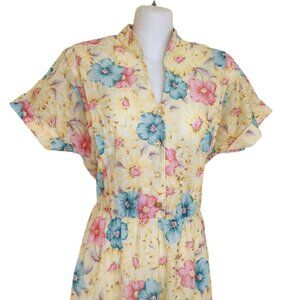 Vintage 80s D'Allaird's midi dress has band collar with v-neck, button closures on bodice, and pleated detail from shoulder shoulders to waist. Short sleeves with cuff detail, elasticized waist. Has small shoulder pads. Yellow with colorful floral print 100% polyester, machine washable. Made in Canada. Women's vintage size "10" fits like a women's medium - see below for garment measurements. Pre-owned condition: Has strings at side of elastic waist to hold a belt, but belt is missing.