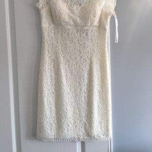 DB Studio White Lace Mini Dress worn as the "party dress/second dress" at my wedding. Stretchy and super comfortable and great for moving in but also hugs your sides to provide a sleek classic look. Cute cup sleeves and frill neckline creating a classic vintage look. Lining beneath the lace to provide more coverage. Slight extra lining in chest. Flattering V shape in back of dress. Originally purchased from Davids Bridal in 2015.