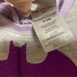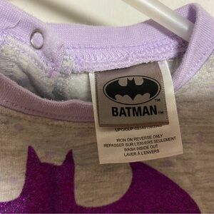 Adorable Batman romper, grey with lilac trim & polka dots, purple glitter writing and Batman symbols.