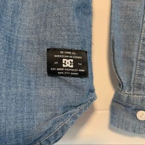 DC brand button up shirt. Denim like material but thinner and softer. Great look and style! In great condition, see photos, no known flaws