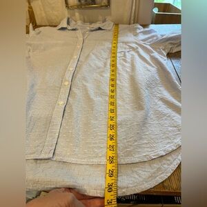 Light blue striped shirt with subtle textured embroidered details, button-up front, and chest pocket. Features 3/4 sleeves with tie cuffs for a feminine touch. Made from 100% cotton for comfort and breathability.
