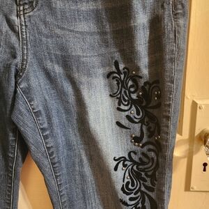 Step into style with these DC Jeans from Penningtons, originally $75, in a flattering 18P (Petite Plus) fit. These medium-wash jeans feature bold black velvet floral embroidery and studded accents, blending timeless denim with trendy Y2K revival and soft grunge aesthetics. Perfect for Fall/Winter 2025, pair them with chunky boots, cozy sweaters, or a layered shacket for that effortless cozy chic vibe.
