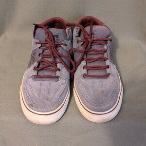 Grey-blue and burgundy-red with red laces. Leather upper and rubber sole. No tread wear on sole. Men's "Lynx Vulc Mid" Skater style shoe, tag says Nov 15 so may be circa 2015. Excellent condition.