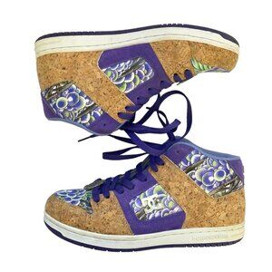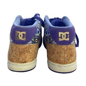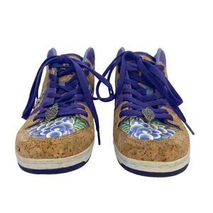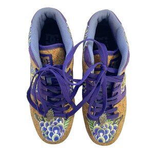 DC SHOES X DARREN BRASS TAN PURPLE GRAPES OF WRATH LACE UP SNEAKERS, DC x Darren Brass Spring 2009 Collection - Tattoo artist Darren Brass from Miami Ink teamed up with DC Shoes to create seven unique collaborations for its Spring 2009 collection. The artist, skateboarder and self-proclaimed sneakerhead developed two men’s and two women’s shoes, two hoodies and a New Era cap incorporating his tattoo and graffiti inspired art for the DC Collection. The two women’s shoes are quite cute, the fruit theme, cork and woven basket are quite interesting with a grape fruit theme featuring a novelty print mixed with a tan cork colorblock style - lace up - white outsole - cushionned in the back heel for comfort - DC metallic logo and a metallic grape on the lace up front - logo on the thongue. Streetwear niché rare find.