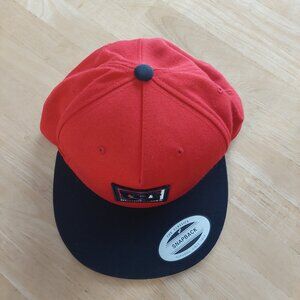 This previously owned hat is in good used condition and features the classic adjustable snapback. red with black brim with a red under brim.