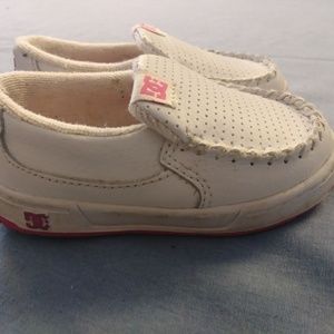 DC Shoes Toddler Girls Villain Slip On Sneakers White Kicks Size 5. Condition is Pre-owned, there is one small spot thats missing material. See last photo. There is the normal marks that used shoes may have. Overall these are still in GUC. Just looking for a new Home.