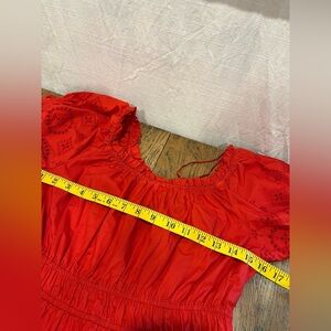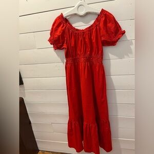 Bright red off-shoulder midi dress in 100% cotton. Features elastic neckline and waist, puffed eyelet sleeves, and a ruffled hem. Feminine and comfortable, perfect for warm days or vacation looks. Size S/P (Small/Petite). Excellent condition.