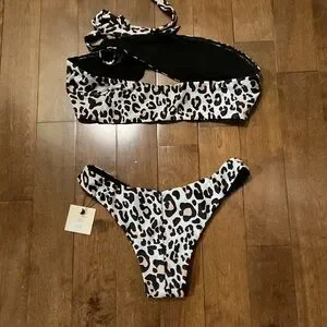 Embrace your wild side with this chic leopard print bikini set. Featuring a bold black and tan pattern, it's perfect for turning heads at the beach or pool.