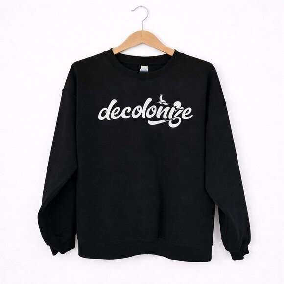 ✨ Keywords: Decolonize, sweatshirt, black, crewneck, graphic, activism, statement, casual, streetwear, cozy, layering, minimalist, comfort, modern, everyday