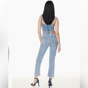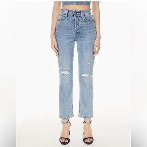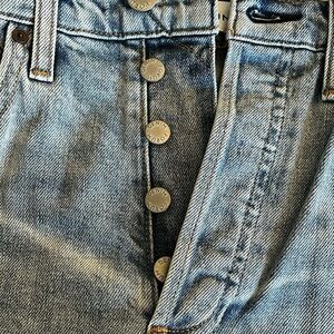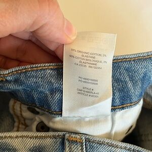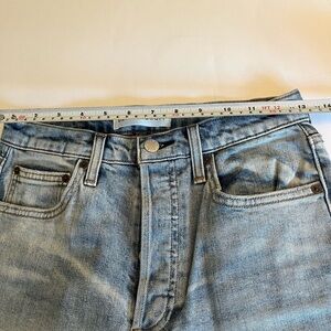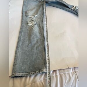 This version comes in a medium-light indigo wash with distressing and a clean hem. EUC, stock photo is slightly shows a different distress. Measurements are approximate