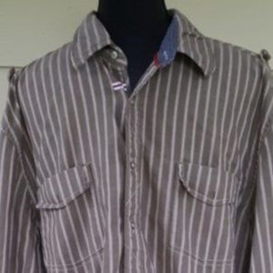 Tommy Hilfiger DENIM Men's khaki green striped button-down SLIM FIT shirt, 2007. Faux pocket flaps, sleeve logo patch, western back yoke, epaulets. 100% cotton. Production date: 05/07.