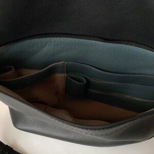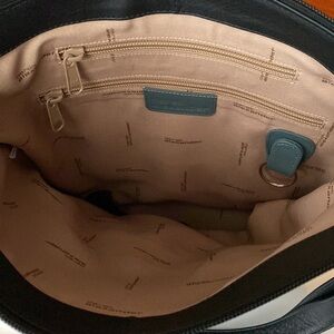 Spacious main compartment secured with top zip and two back wall zippered pockets, removable key ring, plenty of storage space.
