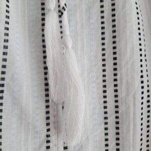 • Long sleeve split neck tassel tie top in white with grey micro square pattern stripe. Featuring high low hem, back waist tie and sleeve end ties.