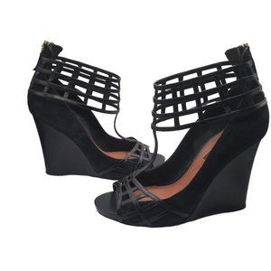 DEREK LAM 'BERYL' Cage T-STRAP BLACK Suede Leather PEEP-TOE WEDGES! Size 7!