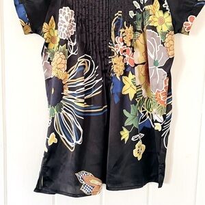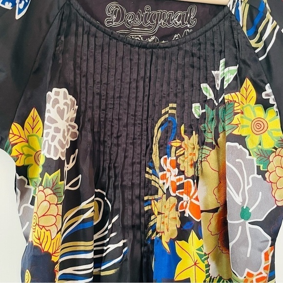 Desigual By C. Lacroix gorgeous floral black blouse style created by famous french designer M. Christian Lacroix features artistic colourful print, round neck, pleated details, short bell sleeves, comfortable fit and glamorous look
