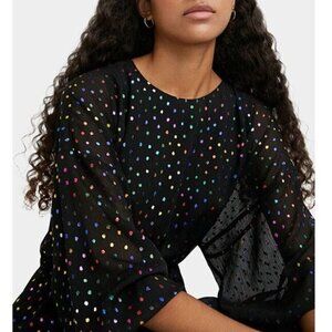 A party dress that you can wear a lot! A simple long sleeve, high neck number, with the most flattering fit and flare floaty shape. And look at the fabric- multicoloured metallic spots just give that chocolate box feeling for the festive season.