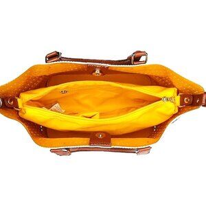 Explore the vibrant and practical DESIGUAL Florida Marine Shopper Bag, a must-have for anyone who loves a splash of color and a touch of sophistication in their accessories. The trapezoid shape of this shoulder bag provides a spacious interior, perfect for carrying all your essentials. The brown polyurethane exterior is adorned with a black and white striped background featuring an abstract multicolour floral print, giving it a lively yet elegant look. Functionality meets style with this bag's convenient features, including a buckle with a magnetic snap button closure, perforated detailing across the entire surface, and an outside compartment with a snap button closure. The interior is lined with a vibrant yellow polyester fabric and comes with a detachable key chain adorned with a brand name charm and bras logo in the front. Whether for casual use, travel, or workwear, this bag's versatility is unmatched, complemented by its durable and synthetic leather-like feel.