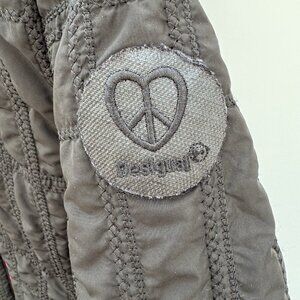 This Desigual Pakaian Jadi Wanita is a black puffer jacket, featuring a geometric quilted design and the brand's signature logo accents that is interchangeable. This is a versatile piece for casual occasions. It's designed with a hood for added warmth, long sleeves to protect against the chill, and a convenient zip and button closure for easy adjustment.