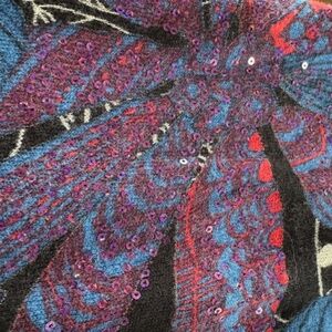 - colour(s): base colour is black with various red tones, white and blue floral pattern; blue flower embellished with purple sequins (see photos)