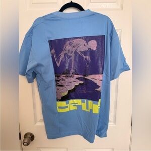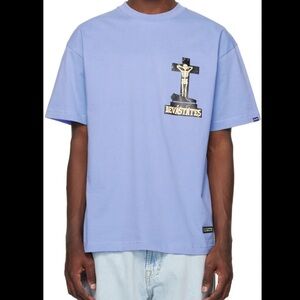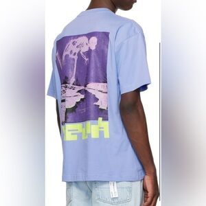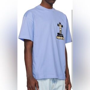 Brand new without tags. Cotton jersey T-shirt. Fading throughout. · Rib knit crewneck · Logo graphic printed at front and back · Rubberized logo patch at front · Logo flag at cuff · Tag at back hem. Washed blue