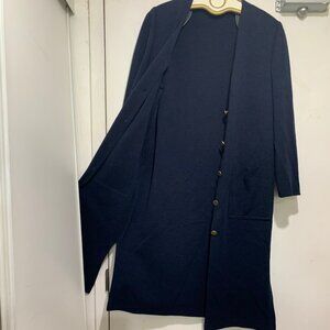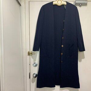 Devernois Long Coat, Missing Size Tag, Fit Size L, Color Blue, 60% Wool, 40% Acrylic, Front Pockets, Sides Split, Shoulder Pad, Closure Button Down, Made in France, Good Condition, Casual Coat, Great Look, Great Fit.