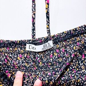 Lovely DEX black floral dress featuring a square neckline, tie-back detail, and smocked waist for a flattering fit. A comfortable yet romantic style perfect for day-to-night wear.