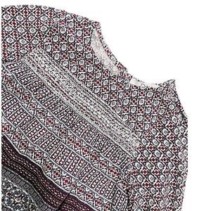 LOVE this little blouse! Gorgeous maroon and grey boho print on a cream background. Pretty white stitched detailing across the chest and buttons on the sleeves so you can wear it up or down. Get this cutey in your bundle with some flared jeans, sandals and jacket for a styled closet discount! EUC.