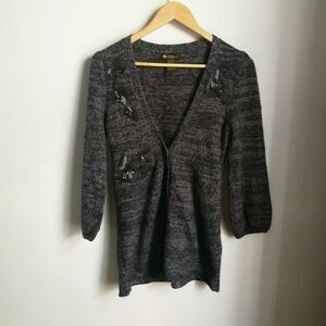 DEX Grey & Floral Embroidery Mohair V Neck Knitted Cardigan Size Small