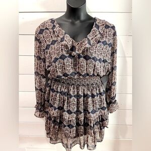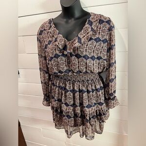 💙 DEX – Navy, Cream & Burgundy Print Dress – Size 2X