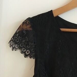 Very sweet holiday dress in size M. Dainty black lace cap sleeves. Black dress under the lace. Fitted at waist. ( waist is 18”.) 100% nylon and lining is 109% polyester. Darts is bodice for tailored fit. Back zipper. Adorable piece for holidays. Feminine, flattering, and chic.