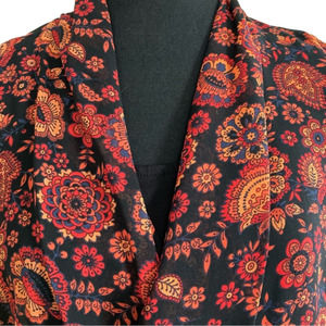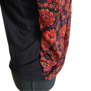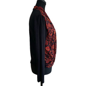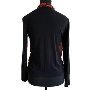 DEX faux wrap red & orange floral pattern on black background blouse. Size S