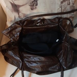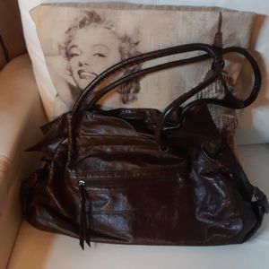 Incredibly soft leather bag is brown and features a zippered closure, zippered pocket on back, 2 zippered pockets inside and several open pockets. 17"×12" with double 27" straps.