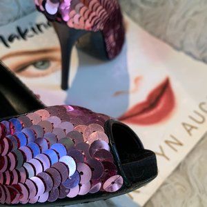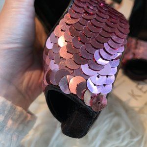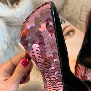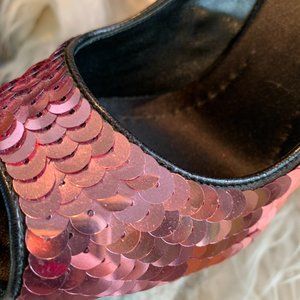 Fun pink sequin D&G heels. They have a small platform so they don't feel as high as they look. Sequins are in good condition, with just a few places where they have started to lift, or are bent. There is a spot near the open toe of the right shoe where they needed to be glued down but are now secure, please see photos. There is also a mark, probably from a sticker, inside the right shoe on the heel. No box, no dust bag included. They fit true to size.