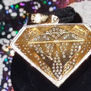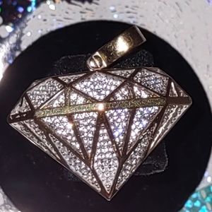 Diamond studded diamond shaped 10k pendant. Sparkly piece that measures approx 3.5 to 4 inches with clasp to hang. It definitely gets attention when worn.