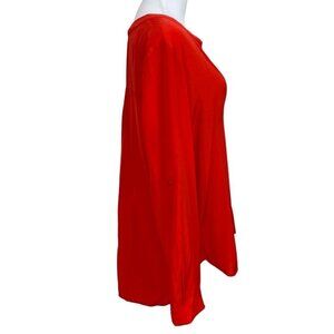 DIANE VON FURSTENBERG ESTI RED SILK ROLLED TAB SLEEVE BLOUSE, This is a super lightweigh 100% silk solid red / orange popover blouse featuring long rolled tab sleeves with one button fastening at cuffs - scoop hemline with a high low style - v-neckline, classic and timeless with a vibrant colorful pigmentation - wearable all year long from summer to winter at the office for a formal business look under a blazer with dress pants or just a jeans for a family dinner or shopping day with friends - wear it for the holiday's / christmas party or valentine's day with a high waist fitted skirt for a cocktail vibe. Versatile - go to blouse, must have.
