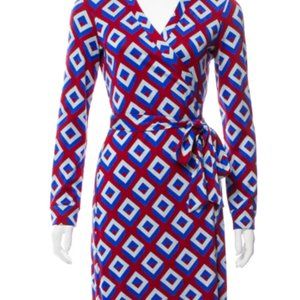 Red, blue and light blue Diane von Furstenberg Jeanne wrap dress with point collar, surplice neck, square diamond print throughout and sash tie at waist.