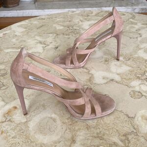 In excellent preowned condition beautiful neutral cream suede leather platform heeled Diane Von Furstenberg sandals. With a 4.75” stiletto heel, elegant crossover straps and a slight platform, these stunning shoes will showcase your summer tanned legs and those extra inches!