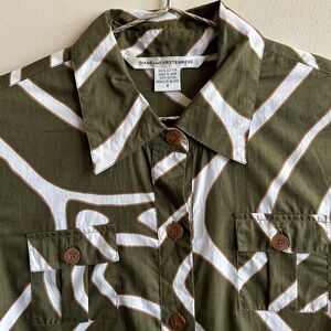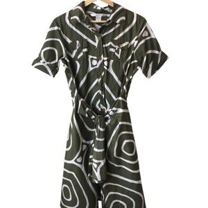 🌿 Diane von Furstenberg Shirt Dress – Olive Green Geometric – Size 8- Fits like a 6