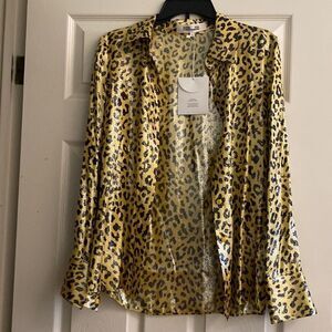 diane von Furstenberg yellow and black metallic printed shirt featuring a full button up front, classic foldover collar, long sleeves with buttoned cuffs, yellow and black allover leopard print and metallic silver detailing woven throughout.