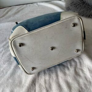 Vintage 70s-style boxy suede shoulder bag in a dreamy blue with white contrast piping and silver-tone hardware. Roomy and structured with a sporty-chic feel, featuring a front zip pocket, sturdy top handles, and a luggage tag detail. Perfect for everyday retro vibes