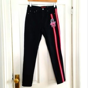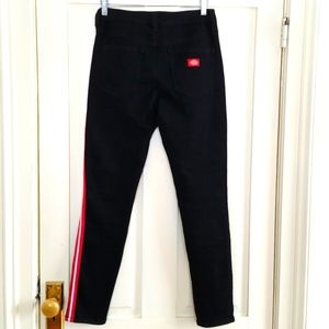 Super cool black jeans with red/white racing stripe from dickies. Zip up front, cropped legs & pockets. Only worn a few times and in near perfect pre-loved condition.